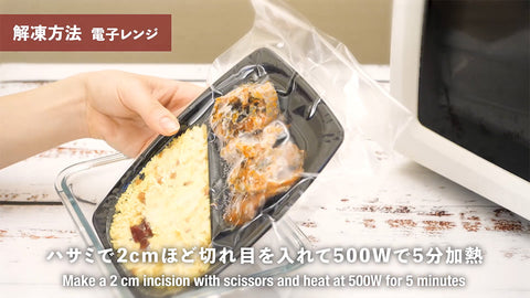 1. 電子レンジ:ハサミで2cmほど切れ目を入れて500Wで5分加熱、温まったら盛り付けへ