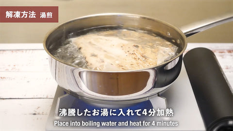 1. 湯煎:沸騰したお湯に入れて4分加熱、温まったら盛り付けへ