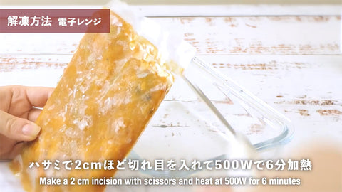 1. 電子レンジ:ハサミで2cmほど切れ目を入れて500Wで6分加熱、温まったら盛り付けへ