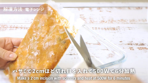 1. 電子レンジ:ハサミで2cmほど切れ目を入れて500Wで6分加熱