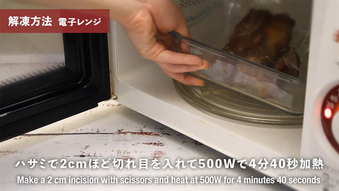 1. 電子レンジ:ハサミで2cmほど切れ目を入れて500Wで4分40秒加熱