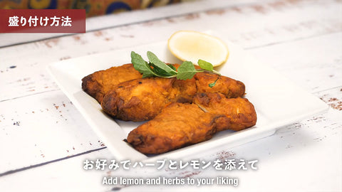ハイデラーバード地方風のフィッシュフライ。骨を抜き、切り身にしたメルルーサ(白身魚)をスパイスでマリネしてカラッと揚げた酸味爽やかな一皿。