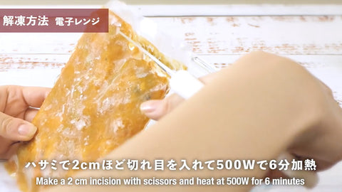 1. 電子レンジ:ハサミで2cmほど切れ目を入れて500Wで6分加熱、温まったら盛り付けへ