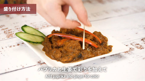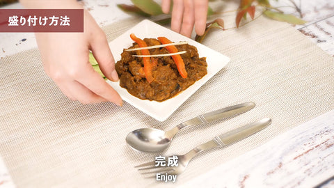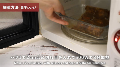 1. 電子レンジ:ハサミで2cmほど切れ目を入れて500Wで3分加熱、温まったら盛り付けへ